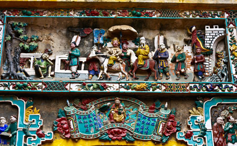 Có lẽ ít người biết đến ngôi chùa này vì mặt tiền của nó bị bao vây bởi hàng quán nhếch nhác… Nhưng qua cổng tam quan, du khách thực sự choáng ngợp khi biết trên khuôn viên 3.000 m2, các hạng mục kiến trúc của chùa từ tam quan, tam bảo đến phật điện, nhà tổ đều được trang hoàng bởi những bức cuốn bằng gốm sứ, tạc khắc hoa văn tinh xảo qua gần 80 năm vẫn còn bóng màu men gạch.