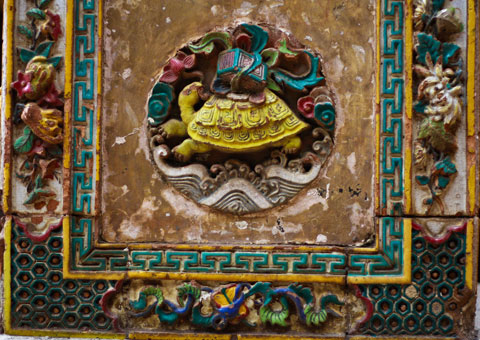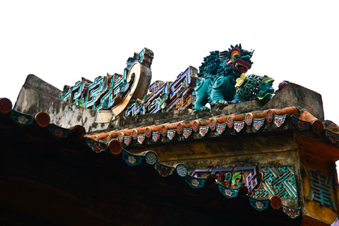 | Đốc tường của chùa được bố trí tượng nghê “gốm” và hoa văn. |